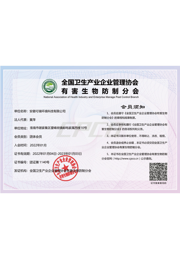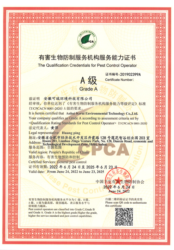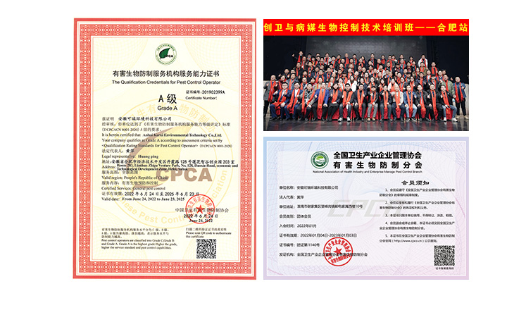 凱瑞蟲控?fù)碛匈|(zhì)量管理體系認(rèn)證、環(huán)境管理體系認(rèn)證、國家有害生物資質(zhì)等各項證書